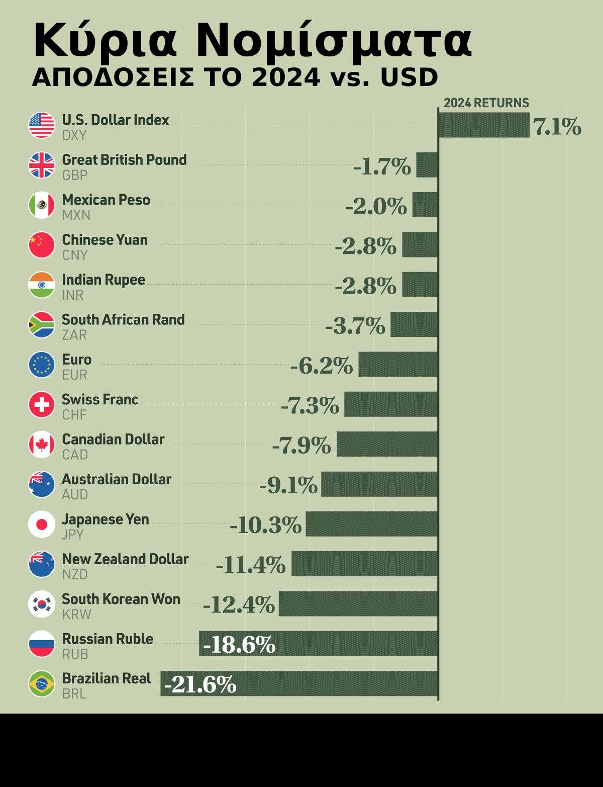 Οι αποδόσεις νομισμάτων αντιπροσωπεύουν το ποσοστό μεταβολής της αξίας ενός νομίσματος σε σχέση με ένα άλλο σε μια συγκεκριμένη περίοδο. Σε αυτή την έκθεση οι αποδόσεις υπολογίζονται βάσει της απόδοσης κάθε νομίσματος έναντι του δολαρίου των ΗΠΑ κατά τη διάρκεια του 2024. Για παράδειγμα, μια απόδοση -6,2% για το ευρώ σημαίνει ότι το ευρώ υποτιμήθηκε κατά 6,2% έναντι του δολαρίου των ΗΠΑ μέσα στο έτος. Αντίθετα, μια θετική απόδοση δείχνει ανατίμηση σε σχέση με το δολάριο ΗΠΑ.