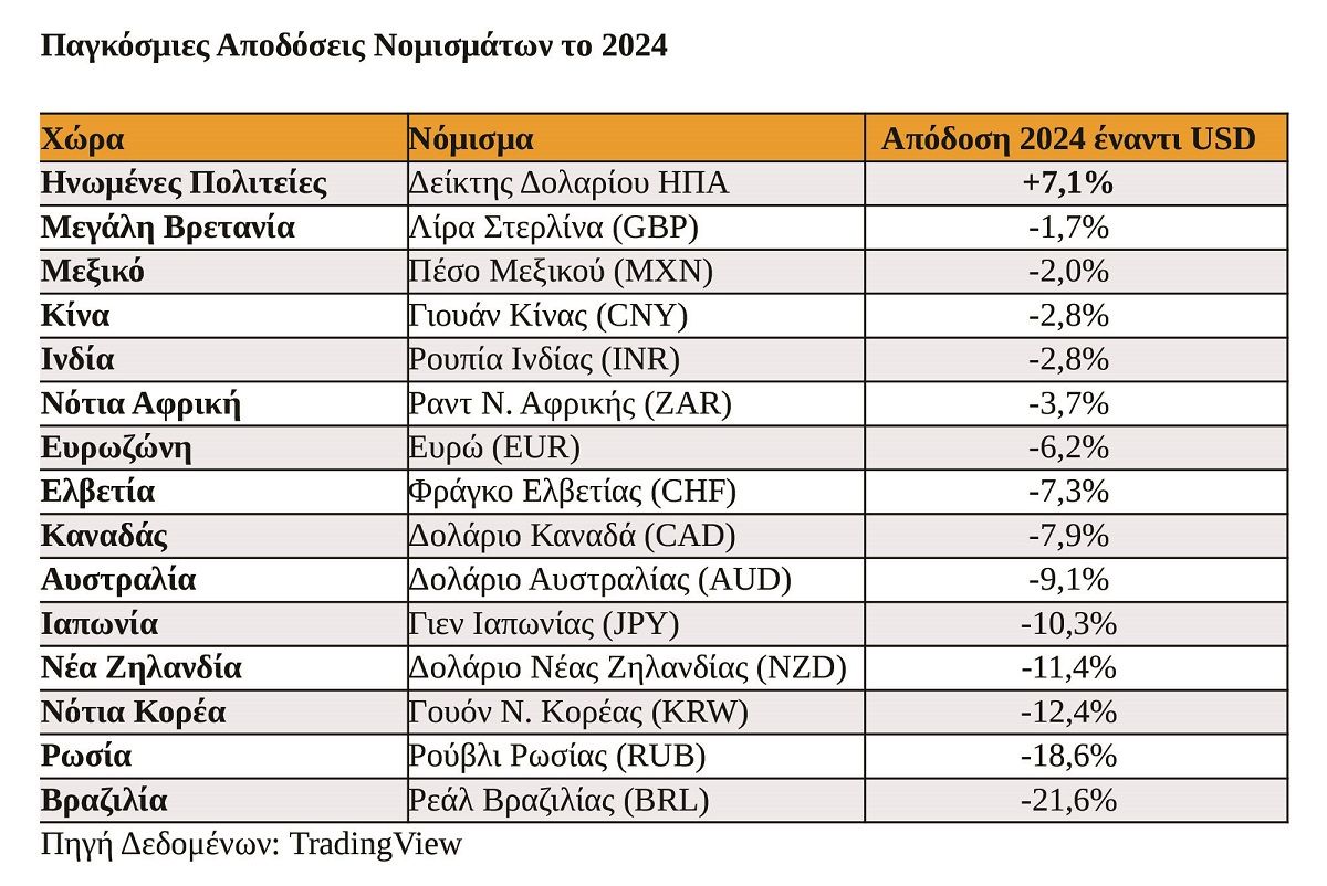 Το 2024 το δολάριο των ΗΠΑ (USD) ισχυροποιήθηκε έναντι των κύριων παγκόσμιων νομισμάτων, αντανακλώντας την ανθεκτικότητα της αμερικανικής οικονομίας, σε ένα πλαίσιο αργής ανάπτυξης στην Ευρωζώνη και την Κίνα.