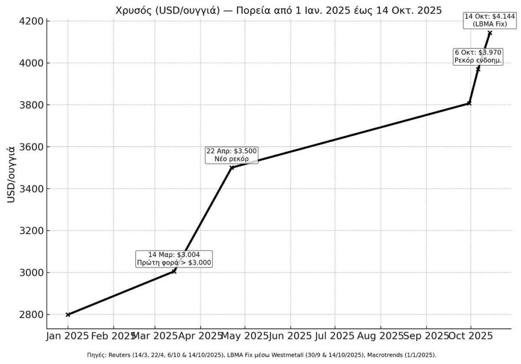 Η πιο εντυπωσιακή επίδοση καταγράφηκε στις 8 Οκτωβρίου, όταν ο χρυσός έσπασε το ψυχολογικό φράγμα των 4.000 δολ. (νέο ρεκόρ στα 4.050,24 δολ.), ανεβάζοντας την ετήσια άνοδο στο 54%. Μέχρι τις 14 Οκτωβρίου η τιμή του έφτανε στα 4.130,61 δολ. ανά ουγγιά, με άνοδο 12,26% σε μηνιαία βάση και 55,26% σε σχέση με την αντίστοιχη ημέρα του 2024.