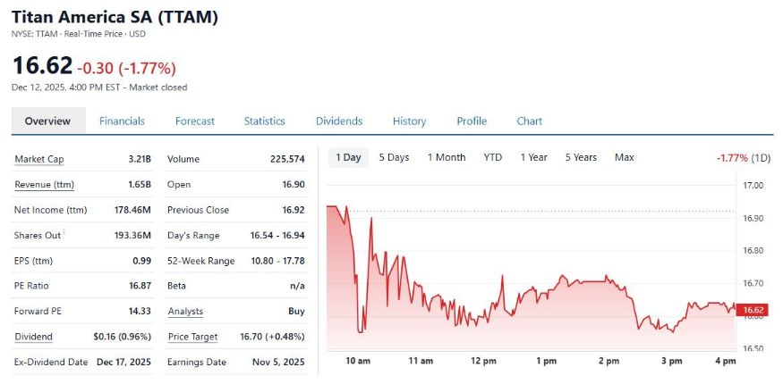 Και ερχόμαστε στο «κλειδί» που θα μπορούσε να… ανοίξει πολύ μεγαλύτερες πόρτες για τη διοίκηση, που δεν είναι άλλο από τη θυγατρική ΤΙΤΑΝ America. Εισηγμένη στο NYSE, με κωδικό ΤΤΑΜ (*), με τη μετοχή στα 16,67 δολ. («κλείσιμο» 12/12), αποτιμάται 3,08 δισ. δολ. ή 2,62 δισ. ευρώ, όταν η εισηγμένη στο Euronext Brussels και πλέον στο Euronext Athens έχει χρηματιστηριακή αξία 3,5 δισ. ευρώ. Σε σταθερά ανοδική πορεία η μετοχή (από τα 11,72 δολ. Απρίλιο 2025), μπορεί τεχνικά να φτάσει πάνω από τα 18 δολ. το πρώτο 3μηνο του 2026. Δηλαδή όταν θα «κλείνει» και τυπικά η συμφωνία με την TraCim και -κατά πάσα βεβαιότητα- το deal με τη Vracks de l’Estuaire, πρακτικά σε χρονισμό ιδανικό για να σχεδιαστεί η επόμενη διάθεση μειοψηφικού ποσοστού της θυγατρικής στις ΗΠΑ. Θυμίζουμε πως ο αρχικός σχεδιασμός -σύμφωνα με το guidance του Δημήτρη Παπαλεξόπουλου- ήταν για διάθεση έως 25% του μ.κ. (διατέθηκε 12%-13%).