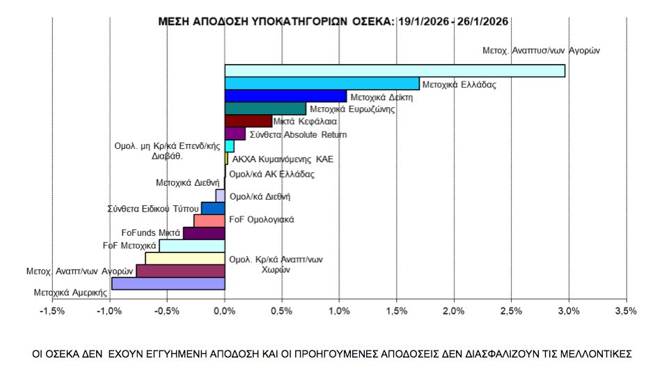 Ως προς τις εισροές, ο πλουραλισμός που υπήρξε στις προηγούμενες εβδομάδες του Ιανουαρίου συνεχίστηκε με τοποθετήσεις νέων κεφαλαίων σε αρκετό αριθμό κατηγοριών. Η υψηλότερη αξία σημειώθηκε στα Σύνθετα Α/Κ Ειδικού Τύπου με 35,87 εκατ. ευρώ. Αμέσως επόμενα τα Μικτά Α/Κ με 23,66 εκατ. ευρώ, τα Μετοχικά Α/Κ Ελλάδας με 11,82 εκατ. ευρώ (πολλά χρόνια η συγκεκριμένη κατηγορία είχε να εμφανίσει ξεκίνημα έτους με εισροές 48,04 εκατ. ευρώ και συνεχιζόμενο επενδυτικό ενδιαφέρον εκ μέρους των μεριδιούχων), τα Ομολογιακά Α/Κ Ελλάδας με 11,07 εκατ. ευρώ, τα Μετοχικά Α/Κ Αναπτυγμένων Αγορών με 10,81 εκατ. ευρώ και τα Ομολογιακά Α/Κ Διεθνή με 6,98 εκατ. ευρώ. Σπάνιο φαινόμενο για την τελευταία κατηγορία στη διάρκεια της τριετίας να βρίσκεται πιο χαμηλά σε εβδομαδιαίο επενδυτικό ενδιαφέρον, αλλά μάλλον θα αρχίσουμε να το βλέπουμε πιο συχνά ως φαινόμενο. Στον αντίποδα, ουσιαστικές εκροές υπήρξαν σε μόνο δύο κατηγορίες, στα ΑΚΧΑ Κυμαινόμενης ΚΑΕ και στα Funds of Funds Μετοχικά με 9,23 και 4,40 εκατ. ευρώ, αντίστοιχα.