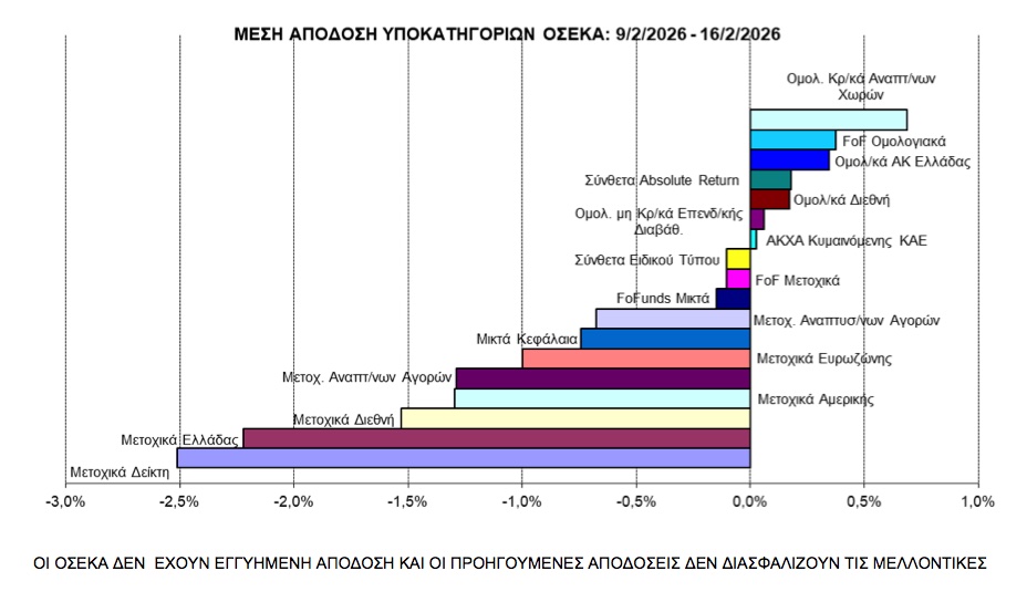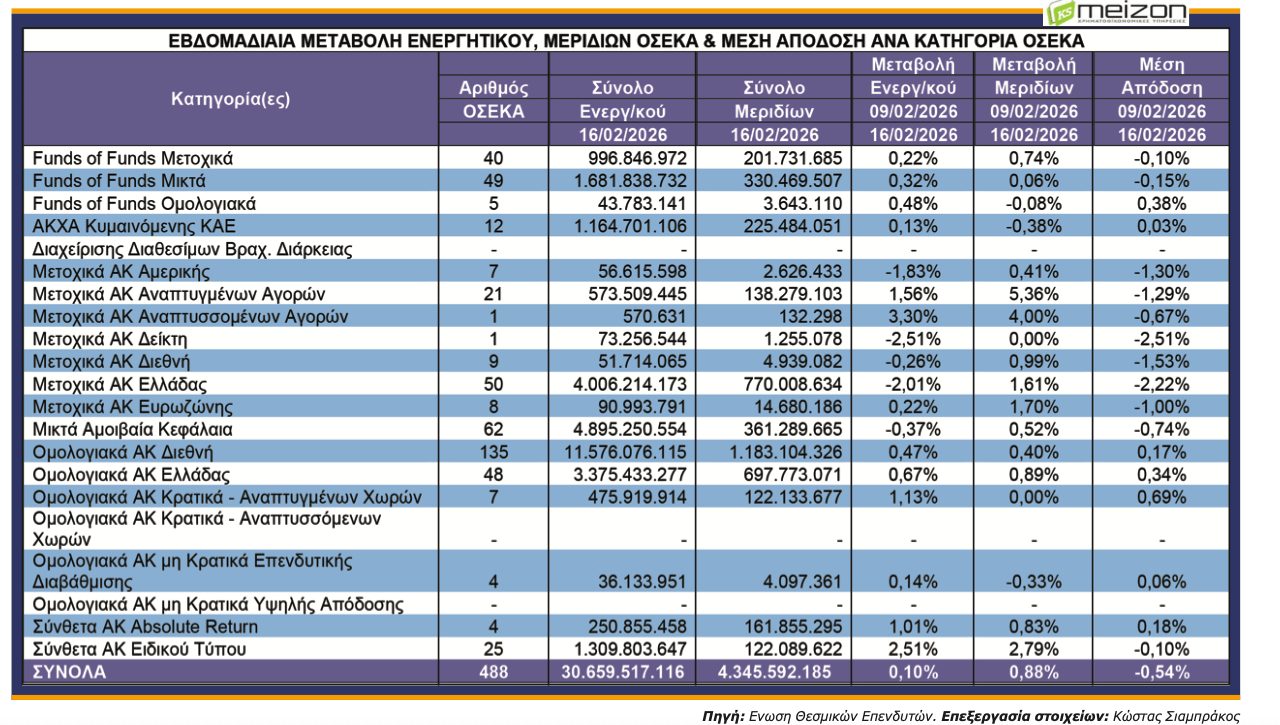 Συμπερασματικά θα λέγαμε ότι, παρά την αρνητική μέση απόδοση της εβδομάδας, η αγορά των Α/Κ διατήρησε την ανοδική της πορεία χάρη στις ισχυρές καθαρές εισροές. Η εικόνα αυτή καταδεικνύει πλέον ωριμότητα και βάθος στη δομή της αγοράς, καθώς η κεφαλαιακή ενίσχυση δεν εξαρτάται αποκλειστικά από τις αποδόσεις. Η διάχυση των εισροών, όπως η φετινή, σε πολλές κατηγορίες είναι επιθυμητή και απαραίτητη, καθώς δημιουργούν ένα περιβάλλον ισορροπημένης ανάπτυξης: Ομολογιακά Α/Κ Διεθνή 205,87 εκατ. ευρώ, Σύνθετα Α/Κ Ειδικού Τύπου 153,52 εκατ. ευρώ, Μικτά Α/Κ 120,17 εκατ. ευρώ, Μετοχικά Α/Κ Ελλάδας 114,27 εκατ. ευρώ, Μετοχικά Α/Κ Αναπτυγμένων Αγορών 82,65 εκατ. ευρώ και Ομολογιακά Α/Κ Ελλάδας 76,54 εκατ. ευρώ.