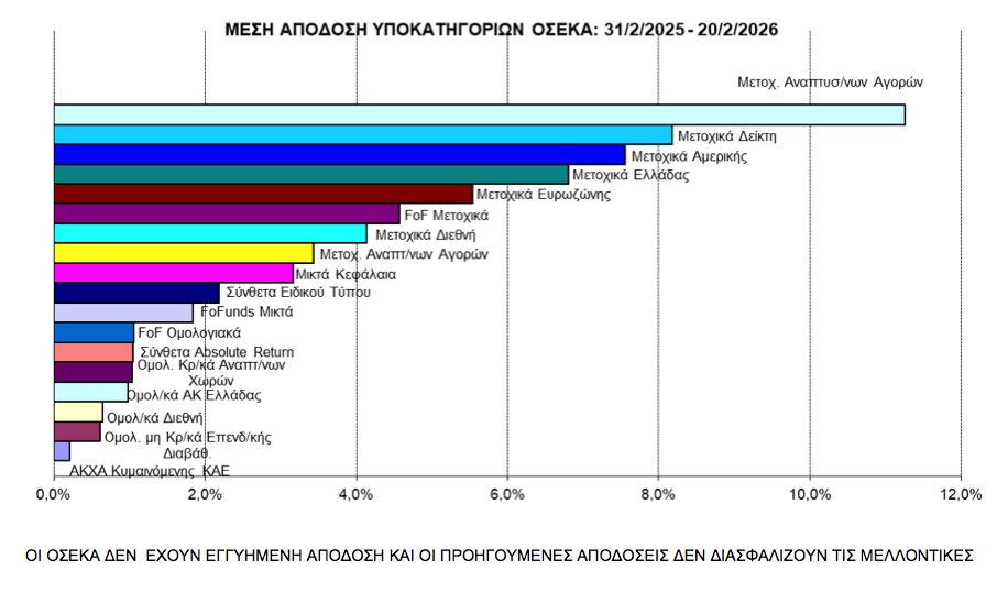 Την περίοδο από 31/12/2025 έως 20/2/2026 η ελληνική αγορά των Αμοιβαίων Κεφαλαίων συνέχισε τη θετική δυναμική με την οποία ολοκλήρωσε το 2025, επιβεβαιώνοντας ότι η ισχυρή περσινή επίδοση δεν αποτέλεσε συγκυριακό φαινόμενο.