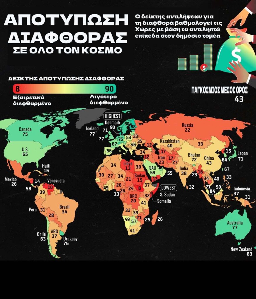 Η διαφθορά αποτελεί μία από τις μεγαλύτερες προκλήσεις της σύγχρονης κοινωνίας, επηρεάζοντας κυβερνήσεις, οικονομίες και κοινωνικά συστήματα. Από τις χώρες με ισχυρά θεσμικά αντίβαρα έως τα κράτη όπου η διαφθορά είναι διάχυτη, ο Δείκτης Αντίληψης Διαφθοράς (CPI) 2024 προσφέρει μια συνολική εικόνα για τα επίπεδα διαφθοράς στον δημόσιο τομέα σε 180 χώρες και εδάφη.