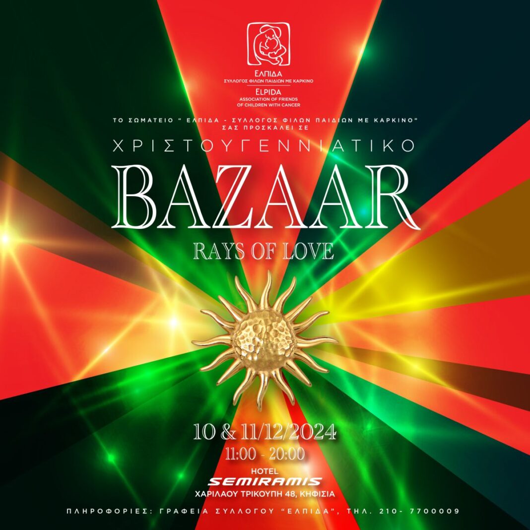Για μια ακόμα χρονιά, το Σωματείο «ΕΛΠΙΔΑ -Σύλλογος Φίλων Παιδιών με καρκίνο», διοργανώνει το πιο χριστουγεννιάτικο Bazaar της πόλης! Την Τρίτη 10 και την Τετάρτη 11 Δεκεμβρίου 2024 στο ξενοδοχείο «SEMIRAMIS» στο Κεφαλάρι από τις 11 το πρωί μέχρι τις 8 το βράδυ ανοίγουμε την αγκαλιά μας και στηρίζουμε τα παιδιά με καρκίνο και τις οικογένειές τους.