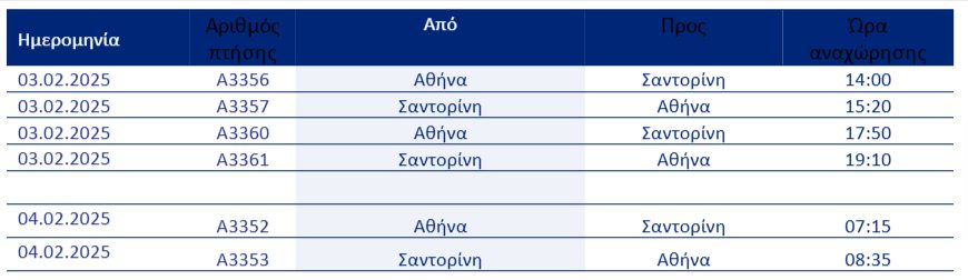 Σημειώνεται ότι και οι τέσσερις (4) τακτικές, προγραμματισμένες καθημερινές πτήσεις από και προς τη Σαντορίνη θα εκτελούνται κανονικά και σύμφωνα με τον αρχικό προγραμματισμό.