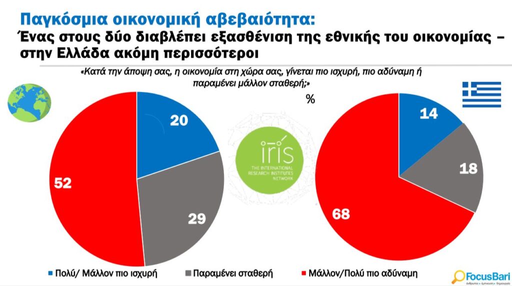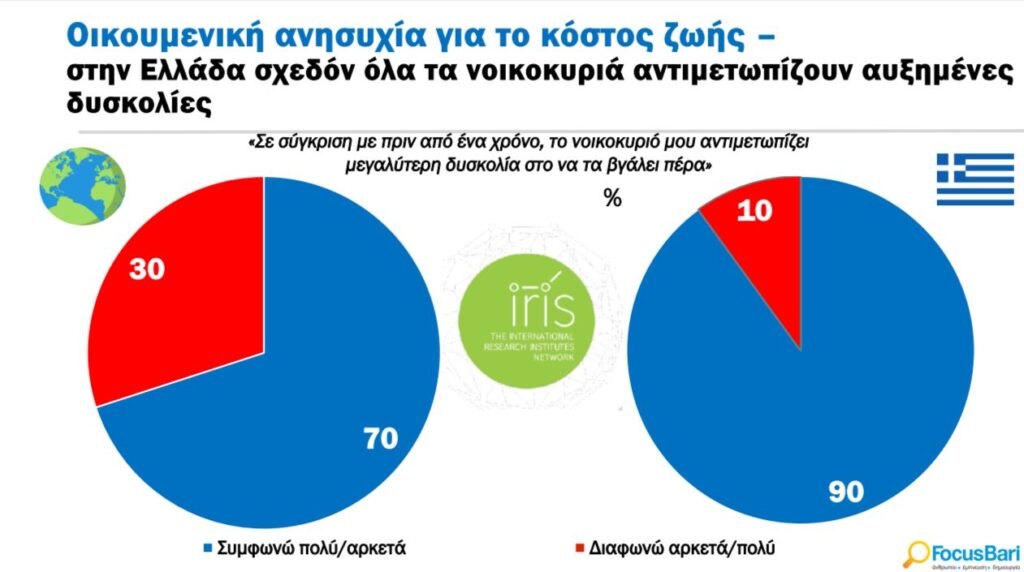 Έρευνα Focus Bari – IRIS: Η Ελλάδα καταγράφει από τα υψηλότερα ποσοστά παγκοσμίως σε απαισιοδοξία και πίεση στα νοικοκυριά.