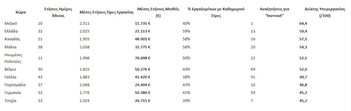 Στην Ελλάδα, οι εργαζόμενοι δουλεύουν κατά μέσο όρο 2.025 ώρες τον χρόνο, ένα από τα υψηλότερα επίπεδα διεθνώς, ενώ το 59% δηλώνει ότι βιώνει καθημερινό εργασιακό στρες. Παράλληλα, οι Έλληνες λαμβάνουν 32 ημέρες άδειας ετησίως, ποσοστό υψηλότερο από αρκετές άλλες χώρες της λίστας.