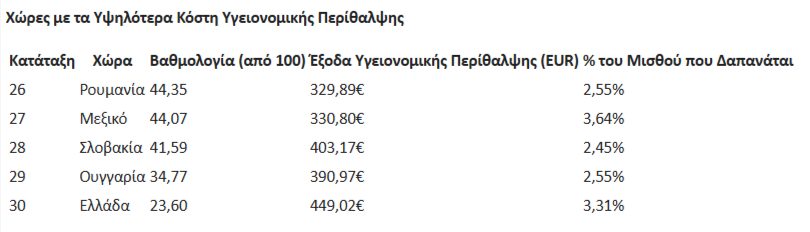 Η Ελλάδα συγκεντρώνει 23,6 βαθμούς σε σύνολο 100, με ετήσια δαπάνη 449,02 ευρώ και μέσο ετήσιο εισόδημα 13.565 ευρώ. Το 3,31% του εισοδήματος κατευθύνεται σε έξοδα υγειονομικής περίθαλψης, το υψηλότερο ποσοστό στη διεθνή κατάταξη.