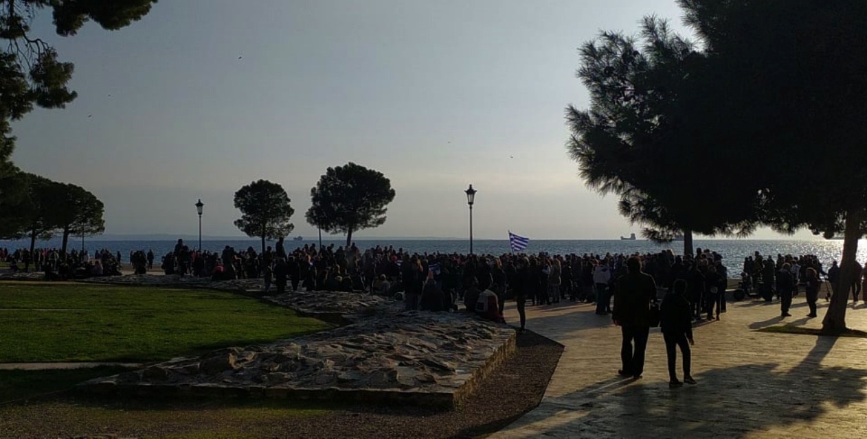 Συγκέντρωση πραγματοποιήθηκε το απόγευμα στον Λευκό Πύργο σε ένδειξη διαμαρτυρίας για τα μέτρα κατά της εξάπλωσης της πανδημίας.