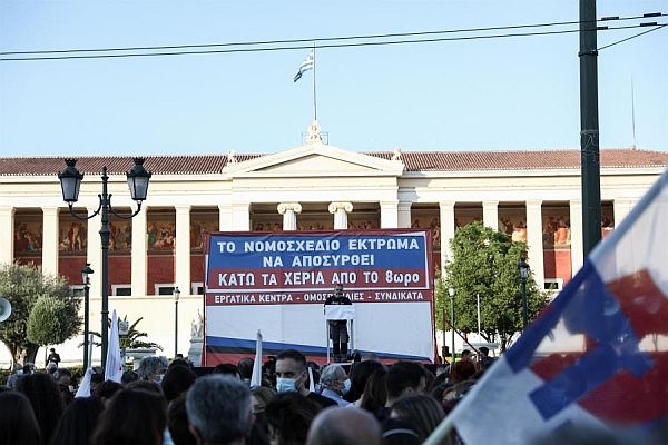 Οι διαδηλωτές και οι διαδηλώτριες με κεντρικό σύνθημα «Το νομοσχέδιο έκτρωμα να αποσυρθεί, κάτω τα χέρια από το οκτάωρο», συγκεντρώθηκαν στα Προπύλαια, ζητώντας την απόσυρση του νομοσχεδίου και την προστασία του οκταώρου, ενώ αυτή την ώρα κατευθύνονται με πορεία προς το Σύνταγμα.
