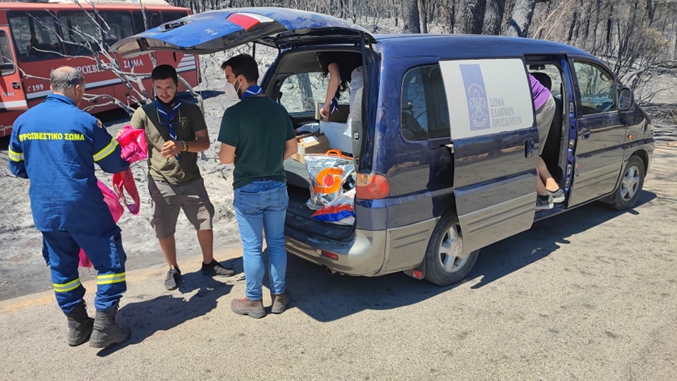 Οι Έλληνες Πρόσκοποι πάντοτε πιστοί στην υπόσχεσή τους να «βοηθούν κάθε άνθρωπο, σε κάθε περίσταση» και κινητοποιημένοι από την ανείπωτη περιβαλλοντική καταστροφή που συμβαίνει στη χώρα, ενεργοποιήθηκαν άμεσα για να συνδράμουν το ηρωικό έργο των πυροσβεστικών δυνάμεων. Στην Αττική, την Αχαΐα, την Ηλεία, τη Καλαμάτα, τη Ρόδο, τη Χαλκίδα οι Πρόσκοποι προσέτρεξαν αρχικά για να προσφέρουν κρύο νερό και φαγητό στις δυνάμεις που επιχειρούσαν και στη συνέχεια στην παροχή άμεσου φαρμακευτικού υλικού που ήταν απαραίτητο στην «πρώτη γραμμή».