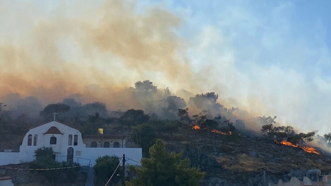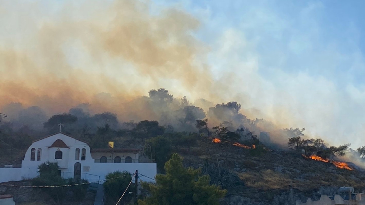 Η πυρκαγιά στη Σαλαμίνα φαίνεται σοβαρή καθώς αυτή την ώρα μαίνεται σε τρία μέτωπα.