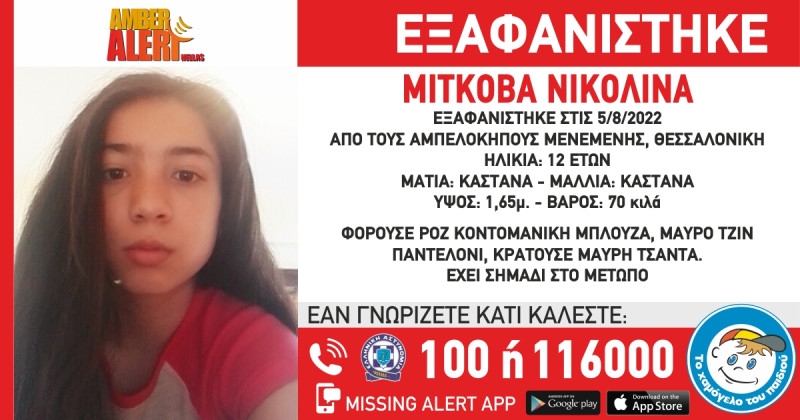 «Στις 05/08/2022, και ώρα 15.00, εξαφανίστηκε από την περιοχή των Αμπελοκήπων Μενεμένης στη Θεσσαλονίκη, η Μίτκοβα Νικολίνα, 12 ετών, βουλγαρικής καταγωγής. Το Χαμόγελο του Παιδιού ενημερώθηκε για την εξαφάνιση της ανήλικης Μίτκοβα Νικολίνας, στις 05/08/2022, βραδινές ώρες και προχώρησε άμεσα στην ενεργοποίηση του μηχανισμού AMBER ALERT HELLAS.