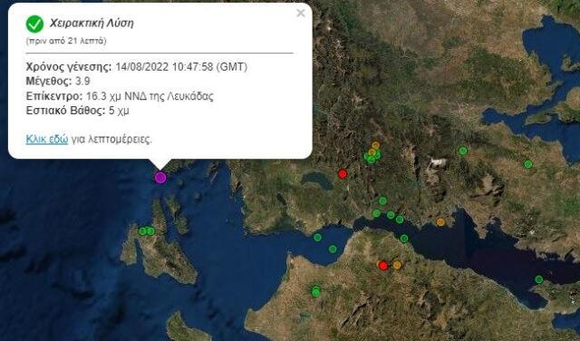 Σεισμική δόνηση μεγέθους 3,9 βαθμών της κλίμακας Ρίχτερ σημειώθηκε σήμερα το μεσημέρι στη Λευκάδα.