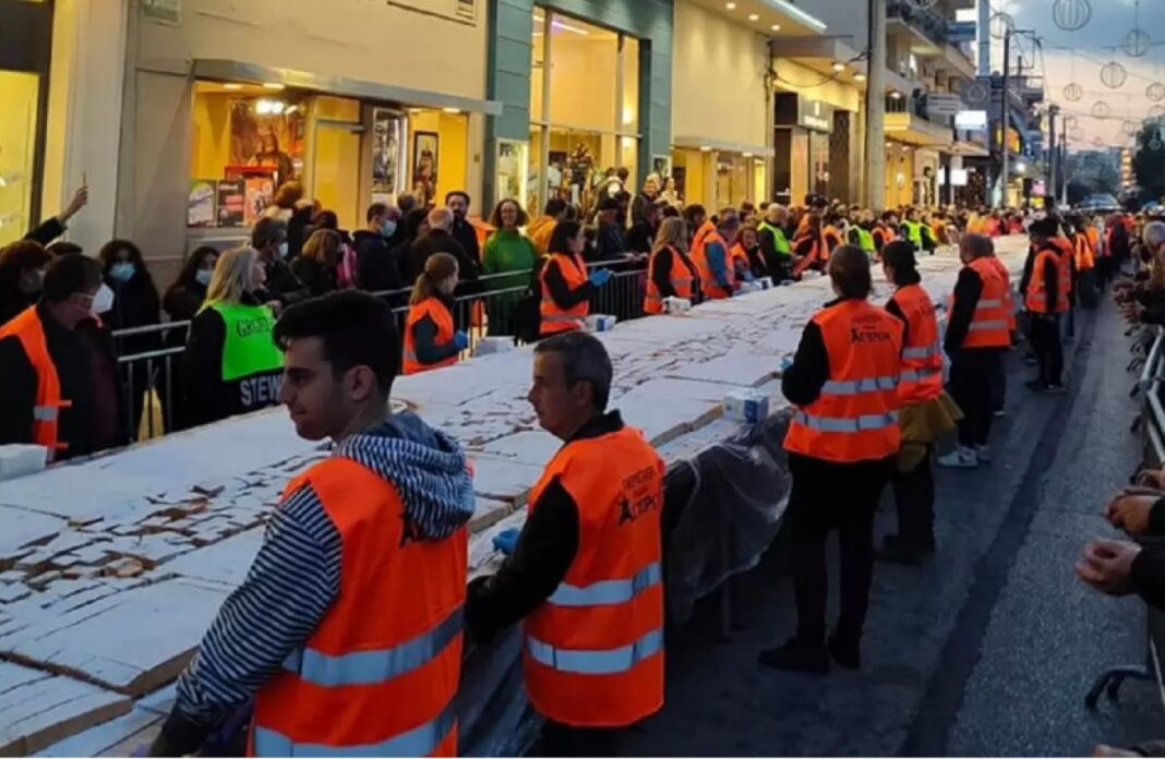 Μία απίστευτη εικόνα δημιουργήθηκε στο Περιστέρι, με τη γιγαντιαία βασιλόπιτα, με περισσότερα από 50.000 κομμάτια να καλύπτει όλο το μήκος της οδού, παράπλευρα από την πλατεία Δημαρχείου.