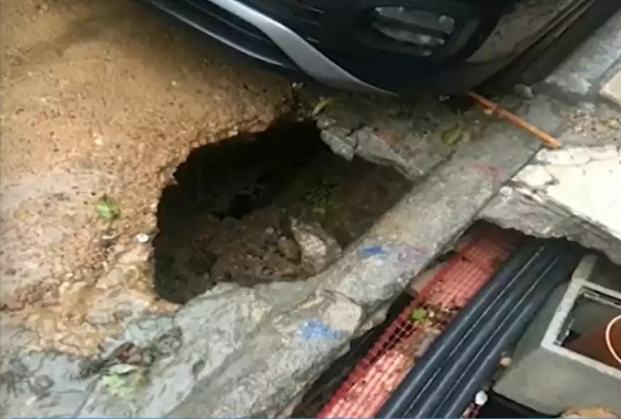 Στην οδό Χαριλάου Τρικούπη 98, χθες Πέμπτη το πρωί από την έντονη βροχή, το οδόστρωμα υποχώρησε, άνοιξε τρύπα, και η γυναίκα, που περνούσε από το σημείο έπεσε μέσα.