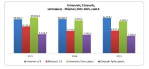 Η εικόνα, ωστόσο, είναι ακόμα πιο δυσμενής τον Μάρτιο, σύμφωνα με την τελευταία έκθεση της ΕΛ.ΣΤΑΤ. Οι εξαγωγές πετρελαιοειδών και καυσίμων καταποντίστηκαν κατά -42%, βάσει της ανάλυσης των στοιχείων που πραγματοποίησαν ο Πανελλήνιος Σύνδεσμος Εξαγωγέων και το Κέντρο Εξαγωγικών Ερευνών και Μελετών. Σε επίπεδο τριμήνου, μόνο τρεις από τις δέκα βασικές κατηγορίες εξαγωγών κατέγραψαν πτώση. Τα πετρελαιοειδή και καύσιμα μειώθηκαν έντονα, κατά 18,4%.