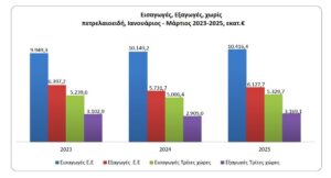 Τα στοιχεία της ΕΛ.ΣΤΑΤ. για τις εμπορευματικές συναλλαγές της χώρας μας παρουσιάζουν ανησυχητικές ενδείξεις που αφορούν γενικά το εμπορικό έλλειμμα αλλά και ειδικότερα τη ζήτηση για τα ελληνικά καύσιμα. Σε γενικό επίπεδο, το εμπορικό έλλειμμα εκτινάχθηκε κατά 25,3% τον Μάρτιο, καθώς ναι μεν οι εισαγωγές αυξήθηκαν με πιο βραδείς ρυθμούς, αλλά ταυτόχρονα οι εξαγωγές κατέρρευσαν. Συνολικά, κατά τον μήνα Μάρτιο η αξία των εξαγωγών διαμορφώθηκε σε 3,935 δισ. ευρώ, έναντι 4,295 δισ. ευρώ πέρυσι, παρουσιάζοντας μείωση κατά 8,4%. Την ίδια στιγμή η αντίστοιχη αξία, αν εξαιρεθούν τα πετρελαιοειδή, παρουσίασε αύξηση κατά 203,1 εκατ. ευρώ, ανερχόμενη σε 6,7%, στα 3,218 δισ. ευρώ. Αν γίνει μια σύγκριση ανάμεσα στα δύο μεγέθη, προκύπτει πως η πτώση που αφορά τα πετρελαιοειδή ανέρχεται στα 560 εκατ. ευρώ.