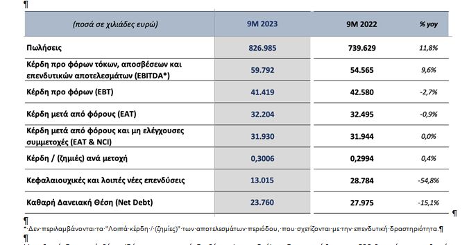 Σε σύγκριση με το αντίστοιχο διάστημα του 2022, οι πωλήσεις αυξήθηκαν κατά 11,8%, η λειτουργική κερδοφορία (EBITDA) κατά 9,6%, τα κέρδη προ φόρων (ΕΒΤ) μειώθηκαν κατά -2,7%, ενώ τα καθαρά κέρδη (ΕAΤ) μειώθηκαν κατά -0,9%. Σημειώνεται ότι τα ποσά του εννεάμηνου 2022 περιείχαν κεφαλαιακά κέρδη €1,3 εκ. από την πώληση μειοψηφικών συμμετοχών και έκτακτα ανόργανα έσοδα €1,2 εκ.. Εξαιρώντας τα εν λόγω έκτακτα και ανόργανα αποτελέσματα, τα κέρδη προ φόρων στο εννεάμηνο 2023 είναι βελτιωμένα κατά περίπου 3% σε σχέση με τα προσαρμοσμένα πέρυσι.