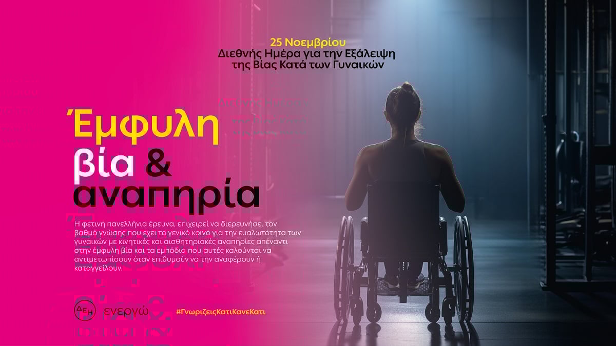 Φως στην αθέατη πραγματικότητα των θυμάτων έμφυλης βίας με αναπηρία, επιχειρεί να ρίξει η ΔΕΗ μέσα από την έρευνα «Έμφυλη βία και γυναίκες με κινητική και αισθητηριακή αναπηρία», με περισσότερα από 2 στα 5 άτομα να δηλώνουν ότι έχουν ακούσει για περιστατικό βίας απέναντι σε γυναίκα με αναπηρία. Για τέταρτη συνεχή χρονιά, η ΔΕΗ συμμετέχει ενεργά στον αγώνα για την εξάλειψη της έμφυλης βίας, αναλαμβάνοντας ουσιαστικές πρωτοβουλίες για την ενημέρωση και ευαισθητοποίηση του κοινωνικού συνόλου με στόχο την καταπολέμηση του φαινομένου.