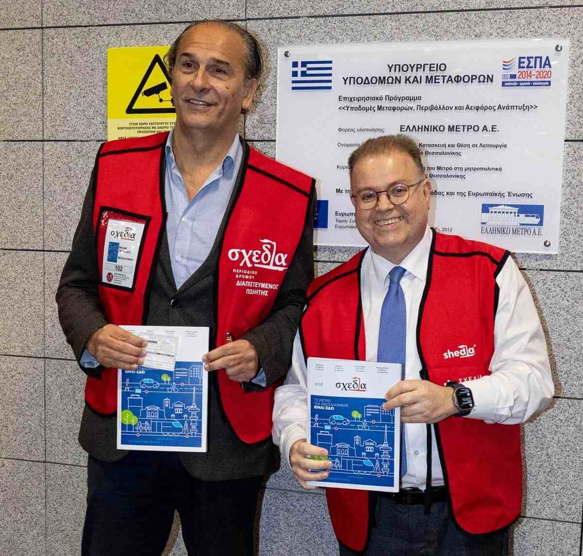 Παλαίμαχοι αθλητές της Θεσσαλονίκης, ο Μπάνε Πρέλεβιτς και ο Ντίνος Κούης, φόρεσαν τα κόκκινα γιλέκα της «Σχεδίας» και ανέλαβαν ρόλους πωλητών του περιοδικού στους σταθμούς «Αγίας Σοφίας» και «Βενιζέλου», συνδυάζοντας την κοινωνική προσφορά με την εξοικείωση των πολιτών με το νέο μέσο μετακίνησης. Αναλυτικότερα, σύμφωνα με την ανακοίνωση: