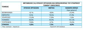 Αναλυτικότερα, εξετάζοντας τα ενοποιημένα μεγέθη και οικονομικά αποτελέσματα αυτού του σημαντικού δείγματος ελληνικών επιχειρήσεων διαπιστώνεται ότι το 2023 μειώθηκαν τόσο οι συνολικές πωλήσεις όσο και η καθαρή κερδοφορία. Βεβαίως, διαφορετική ήταν η εξέλιξη στους επιμέρους τομείς δραστηριότητας.