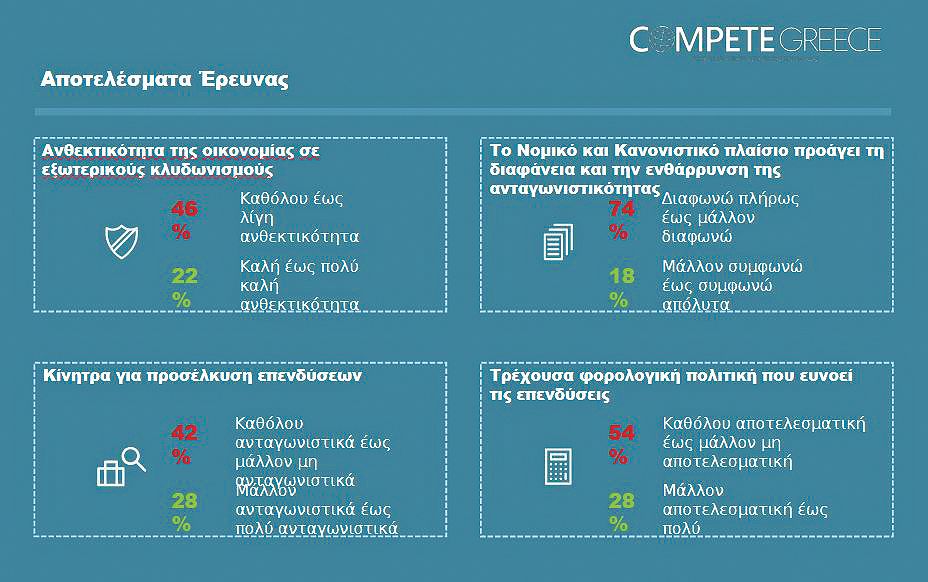 Παρουσία κορυφαίων στελεχών από τις μεγαλύτερες επιχειρήσεις, φορέων χάραξης πολιτικής και ακαδημαϊκών, με τον συντονισμό της δρας Βενετίας Κουσία, εκτελεστικής διευθύντριας του συμβουλίου, παρουσιάστηκαν τα βασικά συμπεράσματα της φετινής έκθεσης ανταγωνιστικότητας καθώς και έρευνα πεδίου που διεξήγαγε το Συμβούλιο Ανταγωνιστικότητας, σε συνεργασία με τις συμβουλευτικές εταιρίες Deloitte, Boston Consulting Group (BCG) και Ernst & Young (EY), η οποία και αποκάλυψε πολύτιμες πληροφορίες σχετικά με την ελκυστικότητα της Ελλάδας ως επενδυτικού προορισμού αλλά και τα εμπόδια που πρέπει να ξεπεραστούν.