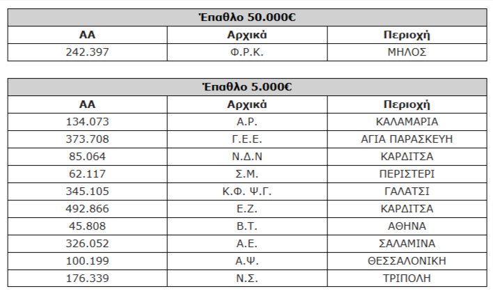 Οι νικητές της κλήρωσης προέρχονται από περιοχές ολόκληρης της Ελλάδας, όπως η Θεσσαλονίκη, η Πάτρα, η Καρδίτσα, η Τρίπολη, τα Γιαννιτσά, η Κοζάνη, οι Σέρρες και άλλες, ενώ ο μεγάλος νικητής αναδείχθηκε στη Μήλο. Ειδικότερα, έχουν αναδειχθεί οι κάτωθι νικητές για τα έπαθλα των 50.000€ & 5.000€ *: