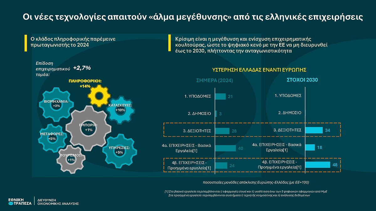 Οι επιχειρηματικές πωλήσεις διατήρησαν τη δυναμική τους το 2024,σημειώνοντας άνοδο της τάξης του 2,7% σε αποπληθωρισμένους όρους, με οδηγό τον κλάδο πληροφορικής, που μέσα σε 2 δεκαετίες τριπλασίασε το μερίδιό του στο ΑΕΠ. Σύμφωνα με το νέο τεύχος «Τάσεις του Επιχειρείν» της Διεύθυνσης Οικονομικής Ανάλυσης της Εθνικής Τράπεζας, η άνω δυναμική, αν και εντυπωσιακή, πρέπει να ενισχυθεί περαιτέρω, καθώς η Ελλάδα κατατάσσεται στις τελευταίες θέσεις της ΕΕ σε κρίσιμους τομείς ψηφιοποίησης, με εμφανείς επιπτώσεις στην παραγωγικότητα. Καθώς οι νέες τεχνολογίες αλλάζουν τους όρους του παγκόσμιου επιχειρείν, κλειδί για την ανταγωνιστικότητα της επόμενης πενταετίας είναι η μεγέθυνση τόσο του κλάδου πληροφορικής όσο και του μέσου μεγέθους του συνόλου των ελληνικών επιχειρήσεων, που θα τους επιτρέψει να κάνουν το «ψηφιακό άλμα» που χρειάζεται για να επιτύχουν τη σύγκλιση με την ευρωπαϊκή τάση.