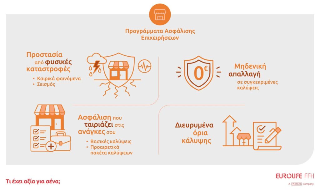 Η Eurolife FFH με το πρόγραμμα ασφάλισης My Business First, προσφέρει μια ολοκληρωμένη λύση για την προστασία των επιχειρήσεων από καταστροφές και απρόβλεπτα περιστατικά. Το πρόγραμμα καλύπτει ζημιές από φυσικά φαινόμενα, πυρκαγιά, έκρηξη, κακόβουλες ενέργειες, καθώς και περιπτώσεις αστικής ευθύνης και απώλειας κερδών.