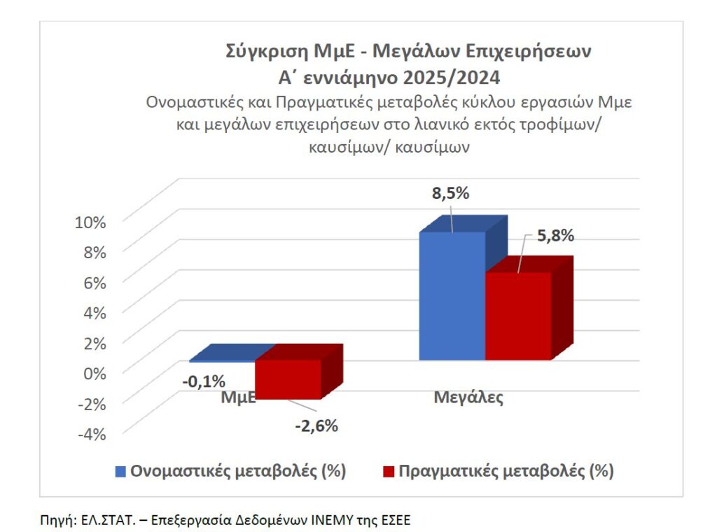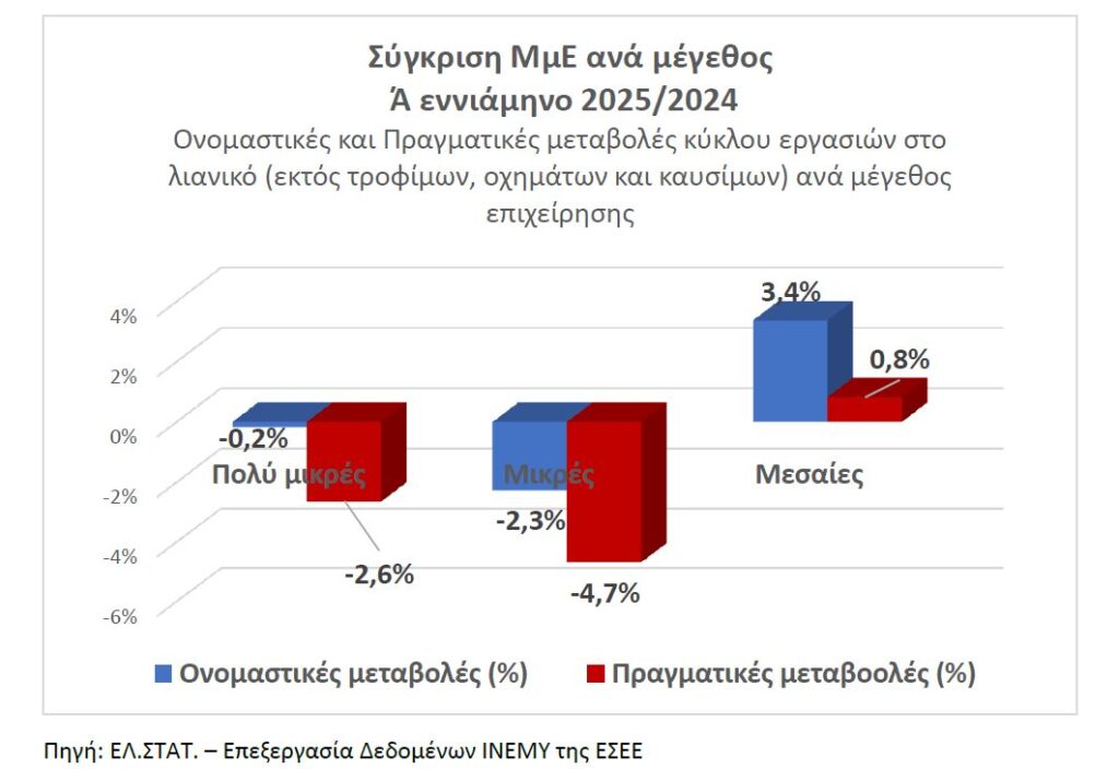 Οι μικρές επιχειρήσεις φαίνεται να πιέζονται περισσότερο, καθώς υποχώρηση των πωλήσεων (-2,3%) καταγράφηκε ακόμα και σε ονομαστικές τιμές.