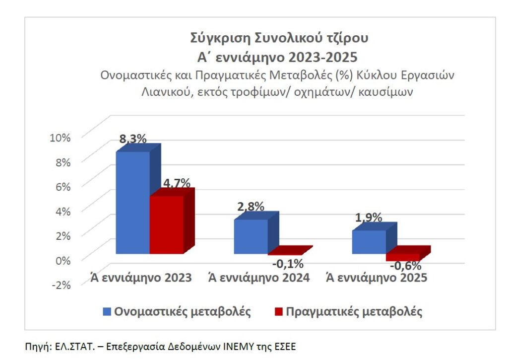 Οι πολύ μικρές επιχειρήσεις εμφανίζουν στασιμότητα πωλήσεων σε σχέση με την ίδια περίοδο του 2024, ενώ μετά τη διόρθωση ως προς τον πληθωρισμό οι πραγματικές πωλήσεις είναι κατά 2,6% χαμηλότερες από τις αντίστοιχες περσινές.