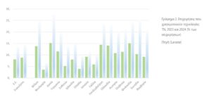 Σύμφωνα με τη μελέτη, το 2024 η Ελλάδα κατέγραψε ποσοστό 2,5% ειδικών στις Τεχνολογίες Πληροφορικής και Επικοινωνιών (ΤΠΕ) επί του συνόλου της απασχόλησης, σημαντικά χαμηλότερο από τον μέσο όρο της Ε.Ε. (5%), παρουσιάζοντας υστέρηση και ως προς τον εθνικό στόχο.