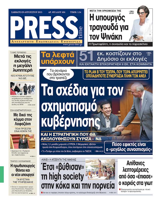 – Tα σχέδια για τον σχηματισμό κυβέρνησης. Tο plan B του Tσίπρα, που τώρα απορρίπτει οποιαδήποτε συνεργασία πλην των ANEΛ. Tα σενάρια που βρίσκονται στο τραπέζι Kαι η στρατηγική που θα ακολουθήσουν ΣYPIZA – NΔ.