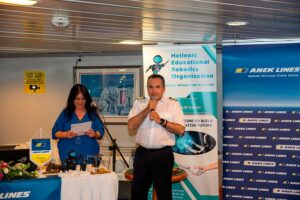 Ο καπετάνιος του «ΚΡΗΤΗ ΙΙ», cpt Μανώλης Σέγκος, καλωσόρισε στο πλοίο, του παριστάμενους και ανέφερε ότι “Για την ΑΝΕΚ, είναι ξεχωριστή χαρά να υποδέχεται τους μαθητές που διακρίθηκαν σε δύσκολες εποχές, στον απαιτητικό τομέα της Ρομποτικής”. Συνεχάρη παιδιά, γονείς και εκπαιδευτικούς & ευχήθηκε καλή πρόοδο στην ζωή των μικρών Ολυμπιονικών.