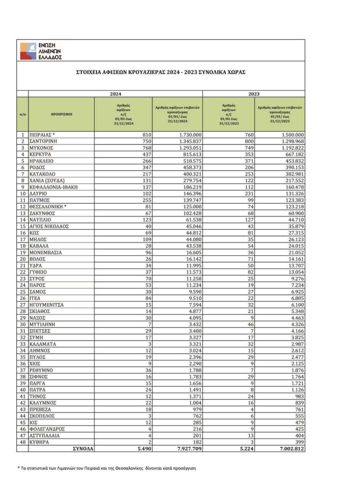 Οι συνολικές αφίξεις κρουαζιερόπλοιων κατά το προηγούμενο έτος 2024 ανήλθαν σε 5.490 και ο αριθμός των επισκεπτών σε 7.927.709, καταγράφοντας επιπλέον 260 αφίξεις πλοίων και 924.559 επιπλέον επισκέπτες έναντι του 2023. Το έτος 2024, σύμφωνα με την Ενωση Λιμένων Ελλάδας, ήταν μια νέα χρονιά-σταθμός για την κρουαζιέρα στη χώρα μας, ξεπερνώντας ακόμα και το προηγούμενο ιστορικό υψηλό του 2023 στις συνολικές αφίξεις επισκεπτών στα 48 ελληνικά λιμάνια-προορισμούς που δέχθηκαν κρουαζιερόπλοια.