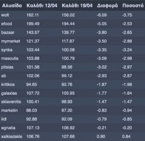 Αναλυτικά στον πίνακα που επισυνάπτεται το κόστος του «Καλαθιού του Νοικοκυριού» ανά σούπερ μάρκετ και η μεταβολή του από την 24η στην 25η εβδομάδα: