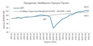 Ο πραγματικός ρυθμός μεγέθυνσης παρέμεινε θετικός σε ετήσια βάση (2,1%) για όγδοο τρίμηνο στη σειρά, ήταν υψηλότερος από τον αντίστοιχο της Ευρωζώνης (1,0%), ωστόσο ήταν χαμηλότερος από τον αντίστοιχο του τετάρτου τριμήνου 2022 (4,8%). Τέλος, αξίζει να σημειωθεί ότι το πραγματικό ΑΕΠ στην Ελλάδα το πρώτο τρίμηνο 2023 ήταν μεγαλύτερο σε σύγκριση με τα προ πανδημίας επίπεδα κατά 5,9% (2,2% στην Ευρωζώνη), ενώ ήταν υψηλότερο κατά 1,4% από το επίπεδο στο οποίο θα βρισκόταν αν από το πρώτο τρίμηνο 2020 αναπτυσσόταν με τον ίδιο ρυθμό με αυτόν που μεγεθυνόταν την περίοδο από το πρώτο τρίμηνο 2017 μέχρι το τέταρτο τρίμηνο 2019. Συνεπώς, παρά την πανδημία και την ενεργειακή κρίση, ωστόσο με τη βοήθεια των εκτεταμένων δημοσιονομικών-νομισματικών μέτρων και του Ταμείου Ανάκαμψης και Ανθεκτικότητας (ΤΑΑ), η ελληνική οικονομία, ήδη από το πρώτο τρίμηνο 2022, βρίσκεται πάνω από το μονοπάτι μεγέθυνσης (growth path) που ακολουθούσε προ πανδημίας.