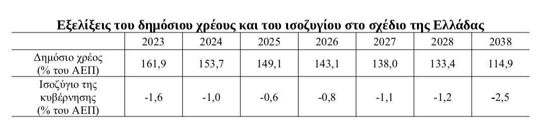 Η Κομισιόν εκτιμά πως, εάν η πορεία των καθαρών δαπανών για την οποία έχει δεσμευτεί το σχέδιο και οι υποκείμενες παραδοχές υλοποιηθούν, το δημόσιο χρέος, σύμφωνα με το σχέδιο, θα μειωθεί σταδιακά από 153,7% το 2024 σε 133,4% του ΑΕΠ στο τέλος της περιόδου προσαρμογής, το 2028. Εκτιμάται, γιατί πρέπει να υπάρχει και πρόβλεψη μεσοπρόθεσμα, κατά τη δεκαετία που έπεται της περιόδου προσαρμογής, πως ο δείκτης χρέους προβλέπεται να συνεχίσει να μειώνεται, σύμφωνα με το σχέδιο, και να φτάσει στο 114,9% έως το 2038.