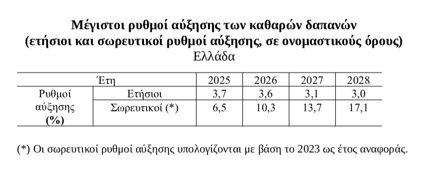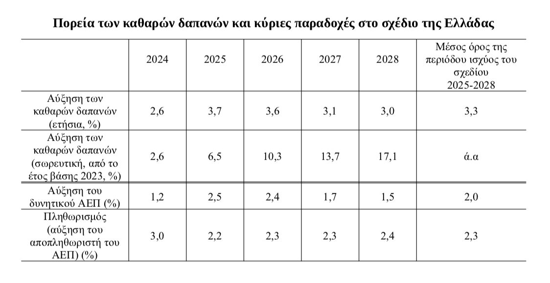 Το εθνικό μεσοπρόθεσμο δημοσιονομικό-διαρθρωτικό σχέδιο της Ελλάδας καλύπτει την περίοδο 2025-2028 και προβλέπει δημοσιονομική προσαρμογή σε χρονικό διάστημα τεσσάρων ετών. Για να το καταθέσει αυτό, προβλέπεται δέσμευση στην πορεία των καθαρών δαπανών, η οποία αντιστοιχεί σε μέση αύξηση των καθαρών δαπανών κατά 3,3% κατά τη διάρκεια των ετών 2025-2028. Βασίζεται στην παραδοχή ότι το δυνητικό ΑΕΠ θα αυξηθεί σε 2,5% το 2025, από 1,2% το 2024, αλλά πως στη συνέχεια θα έχει πολύ χαμηλές πτήσεις, με άνοδο μόνο 1,5% το 2028.