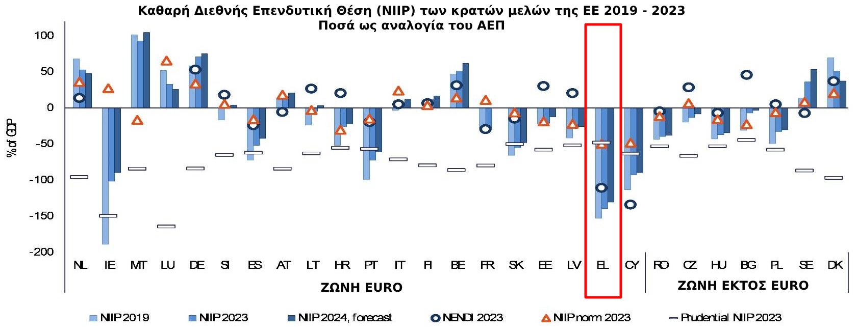 Συνολικά εκτός του ορίου αναφορικά με την καθαρή διεθνή επενδυτική θέση (NIIP), που τίθεται στο -35% του ΑΕΠ, ήταν οκτώ κράτη-μέλη: η Ελλάδα, αλλά και η Ιρλανδία, η Κύπρος, η Πορτογαλία, η Σλοβακία, η Ισπανία, η Ρουμανία και η Ουγγαρία. Μακράν το μεγαλύτερο πρόβλημα όμως είχε και συνεχίζει να έχει η Ελλάδα. Γι’ αυτό οι προβλέψεις για το μέλλον είναι δυσοίωνες, ενώ εκτενής αναφορά γίνεται και για τους δυνητικούς κινδύνους που υπάρχουν σε ευρωπαϊκό επίπεδο.