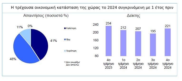 Συγκεκριμένα, με βάση τα αναλυτικά αποτελέσματα της έρευνας του Δεκεμβρίου 2024 (τελευταίο τρίμηνο του έτους), ο δείκτης τρέχουσας οικονομικής κατάστασης της χώρας παρουσίασε βελτίωση στις 221 μονάδες, έναντι 195 το προηγούμενο τρίμηνο. Το ποσοστό των CEOs που δήλωσαν ότι βελτιώθηκε η τρέχουσα οικονομική κατάσταση της Ελλάδας, συγκρινόμενη με ένα έτος πριν, αυξήθηκε σε 41%, έναντι 26% το προηγούμενο τρίμηνο. Σε 48% για τις επιχειρήσεις παροχής υπηρεσιών διαμορφώθηκε το ποσοστό των CEOs που δηλώνουν το ίδιο.