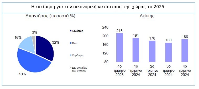 Πιο θετικό, σε σχέση με έναν χρόνο πριν, ήταν το αποτύπωμα που άφησαν οι επιχειρήσεις στην Ελλάδα το τέταρτο τρίμηνο του 2024. Την ίδια στιγμή, οι CEOs, σε ένα σημαντικό ποσοστό τους, εκτιμούν ότι οι εταιρίες τους θα βρεθούν σε ακόμα καλύτερη θέση μέχρι το τέλος του 2025, αν και οι 4 στους 10 προβλέπουν ότι η κατάσταση θα είναι χειρότερη.
