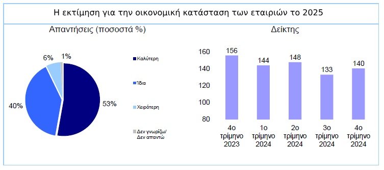 Στο ίδιο πλαίσιο, ο δείκτης προσδοκιών των CEOs για την οικονομική κατάσταση της εταιρίας τους το 2025 σημείωσε άνοδο στις 140 μονάδες, έναντι 133 μονάδων το προηγούμενο τρίμηνο. Το ποσοστό των CEOs που αναμένει βελτίωση στο επόμενο έτος ανήλθε σε 53%. Το ποσοστό αυξάνεται σε 67% για τους CEOs των πολύ μεγάλων επιχειρήσεων.