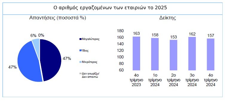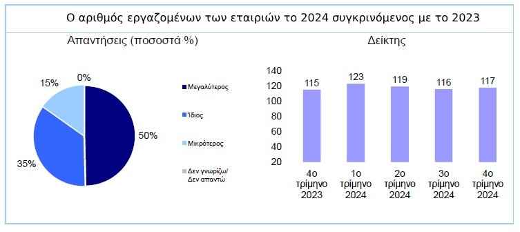 Σύμφωνα με την έρευνα, ο δείκτης τρέχουσας απασχόλησης παρουσίασε οριακή αύξηση στις 117 μονάδες το τελευταίο τρίμηνο του 2024, έναντι 116 το προηγούμενο τρίμηνο. Το ποσοστό των CEOs που δήλωσαν ότι ο αριθμός των εργαζομένων στις επιχειρήσεις τις οποίες διοικούν είναι μεγαλύτερος σε σύγκριση με ένα έτος πριν διαμορφώθηκε σε 50%, έναντι 47% το προηγούμενο τρίμηνο. Το ποσοστό αυτό είναι αυξημένο σε 70% για τους CEOs των βιομηχανικών επιχειρήσεων και σε 66% για τους επικεφαλής των πολύ μεγάλων επιχειρήσεων.
