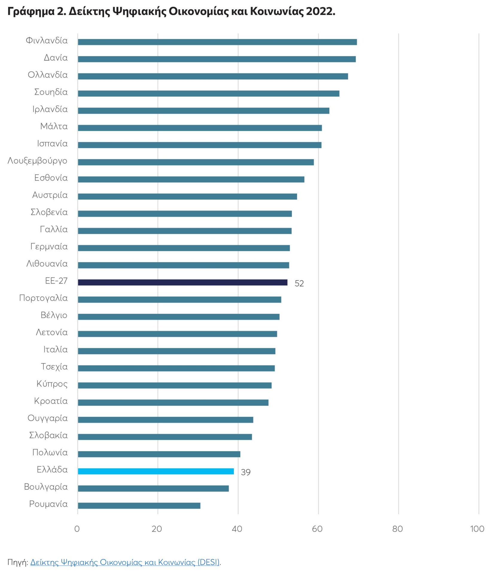 Παράλληλα, η Ελλάδα βρίσκεται στην 25η θέση μεταξύ των κρατών-μελών της Ευρωπαϊκής Ένωσης στον Δείκτη Ψηφιακής Οικονομίας και Κοινωνίας (DESI), ο οποίος αποτυπώνει την πρόοδο των χωρών στον ψηφιακό μετασχηματισμό.
