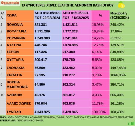 Πιο συγκεκριμένα, με το διάστημα καταμέτρησης να είναι από τις 1/10/23 έως και 21/3/2023, αλλά και το αντίστοιχο διάστημα από τον Οκτώβριο του 2024, εώς και τον Μάρτιο του 2025, οι εξαγωγές λεμονιού αυξήθηκαν κατά 108,43%.