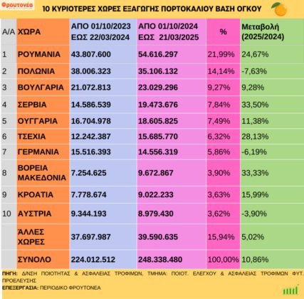 Όσον αφορά τα πορτοκάλια για το ίδιο διάστημα σύγκρισης οι εξαγωγές ανεβαίνουν κατά 10,86% και τα μανταρίνια κατά 14,61%.