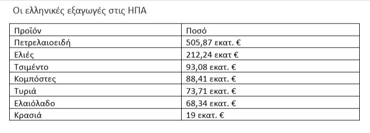 Μεταξύ των σημαντικότερων εξαγώγιμων προϊόντων προς τις ΗΠΑ είναι τα πετρελαιοειδή (505,87 εκατ. ευρώ), οι ελιές (212,24 εκατ. ευρώ), οι κομπόστες (88,41 εκατ. ευρώ), τα τυριά (73,71 εκατ. ευρώ) και το ελαιόλαδο (68,34 εκατ. ευρώ). Σημαντική είναι και η παρουσία του ελληνικού κρασιού, με εξαγωγές ύψους 19 εκατ. ευρώ. Εφόσον οι νέοι δασμοί εφαρμοστούν χωρίς εξαιρέσεις, τα προϊόντα αυτά ενδέχεται να αντιμετωπίσουν αυξημένο κόστος εισόδου στην αμερικανική αγορά, επηρεάζοντας την ανταγωνιστικότητά τους.